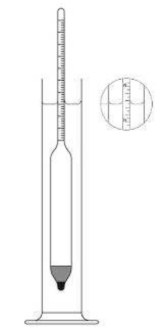 C’est ainsi que fonctionne le densimètre à flotteur6 : plus la masse volumique de l’eau dans laquelle on le plonge est élevée, moins il s’enfonce ; une échelle graduée préalablement calibrée permet de lire directement le résultat exprimé en densité. Toutefois, ce type de densimètre ou « hydrometer » en anglais, contrairement à la dénomination, ne mesure pas la densité théorique, mais le rapport des masses volumiques de l’eau testée à celle de l’eau distillée à une température d’étalonnage donnée (et non à 4°C!). Les densimètres sont en général étalonnés à 60°F (15,56°C) chez les anglo-saxons, 20°C ou 25°C dans le système métrique. A la température d’étalonnage, les densimètres mesurent 1,000 dans l’eau distillée. Une mesure n’est donc valide qu’à la température étalon, soit 25°C dans le cas présent.