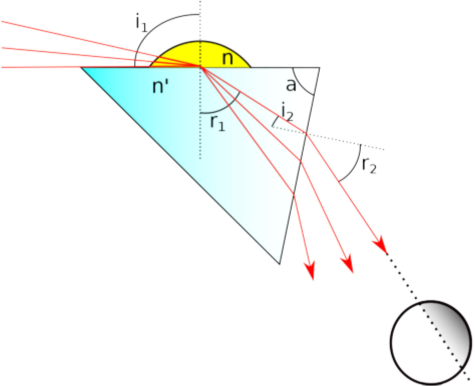 On considère un prisme dont les caractéristiques sont connues (angle a du sommet et indice n’), situé dans l’air (d’indice 1) sur lequel on dépose une goutte d’échantillon inconnu (EdM d’indice n à déterminer). On considère également un rayon entrant en incidence rasante, c.-à-d. ≈ 90° par rapport à la normale au point d’incidence. En effet, si l’angle incident i1 est > 90° le rayon n’est plus réfracté, il est réfléchi (plage sombre) ; r1 est appelé « angle limite de réfraction » ou « angle critique ».