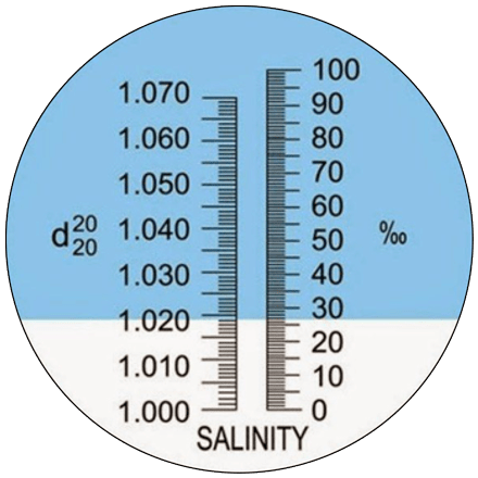 En ce qui concerne les réfractomètres spécifiquement conçus pour l’EdM, l’affichage est automatiquement converti en densité et en salinité (voir figure). La lecture s’effectue à la limite entre la zone bleue et incolore. A noter que la salinité se lit en ‰ (ppt = parts per thousand = g.kg-1) et que la densité est notée SG (Specific Gravity). L’instrument est en général étalonné à 20°C et possède un ATC (Automatic Temperature Compensation) car l’indice de réfraction est fonction de la température.