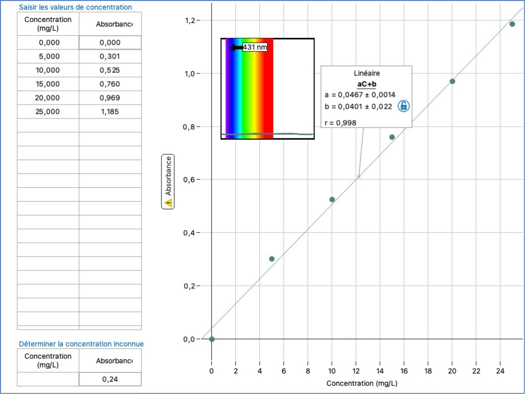 Comme l’absorbance de la concentration inconnue (Evian) est de 0,24, la concentration (C) en NO3– de cette eau est de 4,28 mg.L-1.