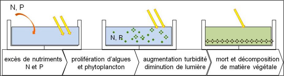 L’eutrophisation (du grec ancien : εὖ / eû, « bien », et de τροφή / trophḗ, « nourriture ») est le processus par lequel des nutriments s’accumulent dans un milieu ou un habitat (terrestre ou aquatique). Les causes sont multiples et peuvent donner lieu à des situations d’interactions complexes entre les différents facteurs. Les nutriments concernés sont principalement l’azote (provenant surtout des nitrates agricoles et des eaux usées, ainsi que secondairement de la pollution automobile) et le phosphore (provenant surtout des phosphates agricoles et des eaux usées). L’ensoleillement ou la température de l’eau (qui tend à augmenter avec le réchauffement climatique) peuvent exacerber l’eutrophisation16.